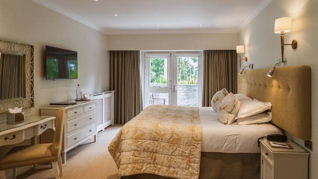 Large en-suite double room with extra beds or cot (on request), overlooking the gardens.